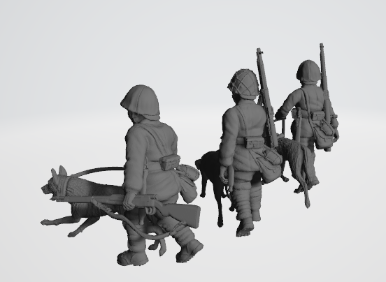 3 Handler 3 Dogs. 28mm Scale. Product is made in high quality Studio Historia Blended resin, flexible and detailed. Product is not intended for children