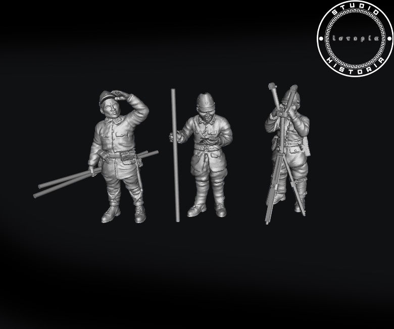 3 figures with observation equipment. M98 Uniform & Type 92 Helmet. 28mm Scale. Product is made in high quality Studio Historia Blended resin, flexible and detailed. Product is not intended for children. Painted samples show observer from 8cm Mortar Team, which is not included in this set.