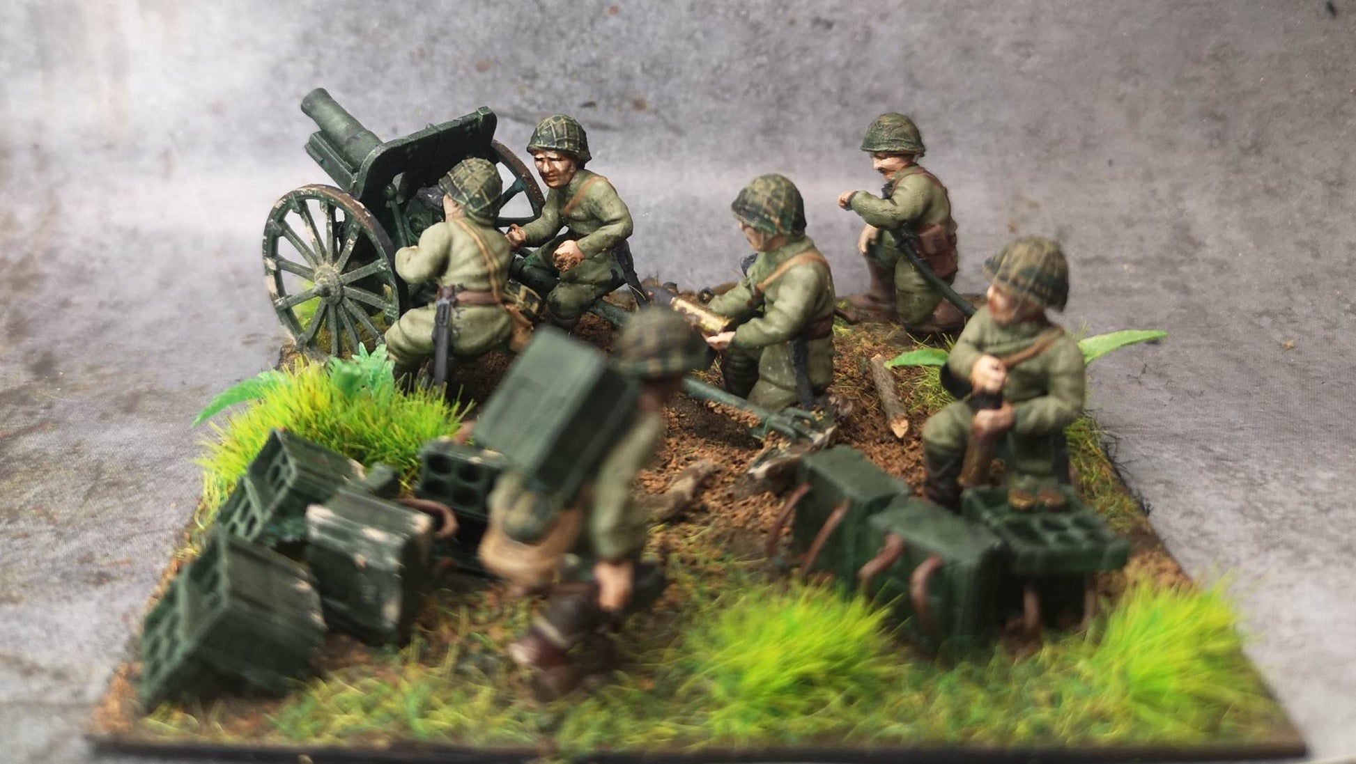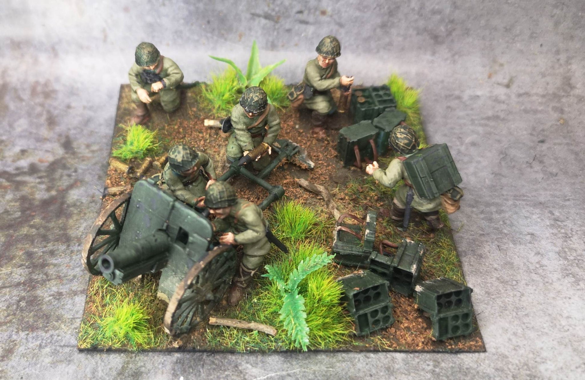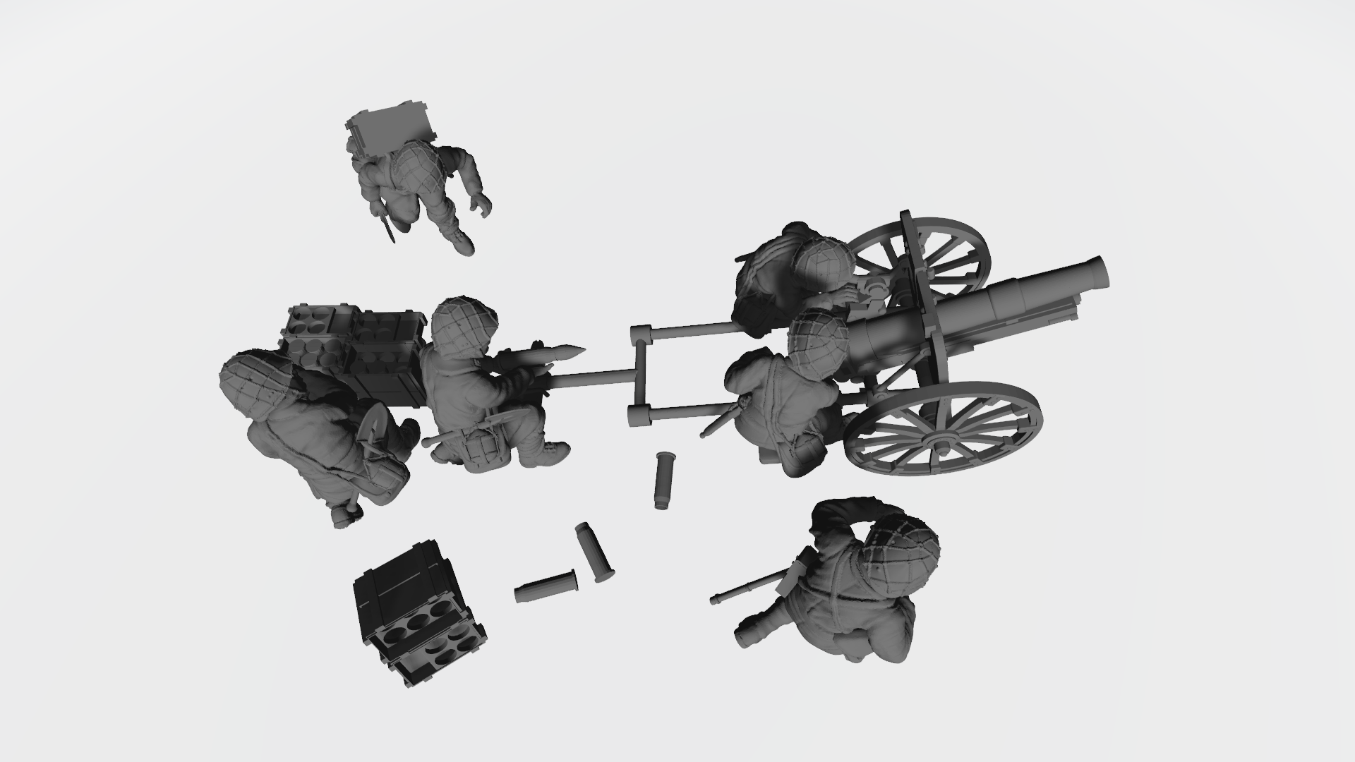 6 crew. 1 Commander; 2 Gunners; 2 loaders; 1 ammo bearer. 28mm Scale. Product is made in high quality Studio Historia Blended resin, flexible and detailed. Product is not intended for children