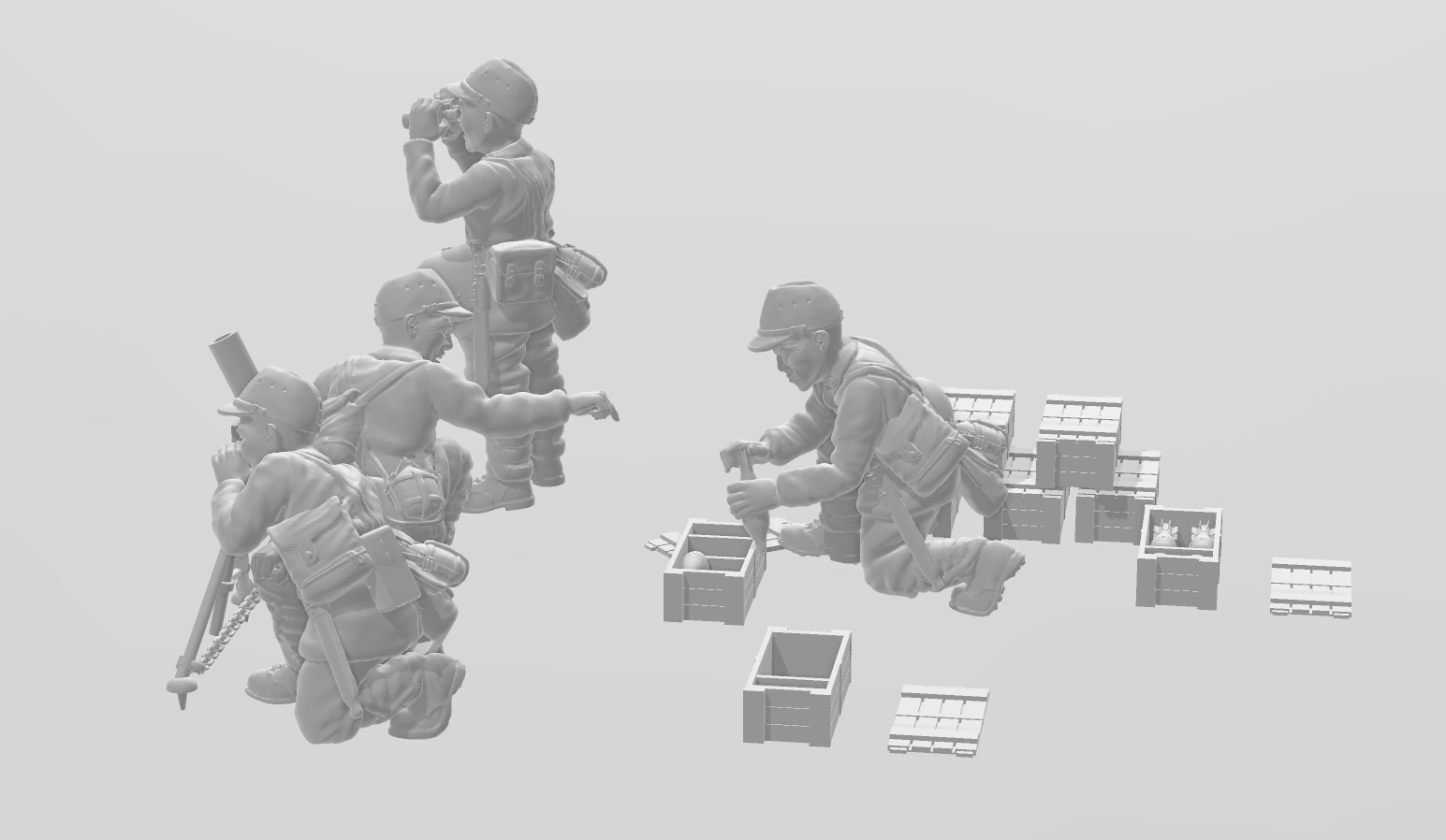 4 models, mortar, 4 cases, 4 mortars. Spotter, Loader, Gunner, Ammo Bearer, M98 Uniform & Type 92 Helmet. 28mm Scale. Product is made in high quality Studio Historia Blended resin, flexible and detailed. Product is not intended for children
