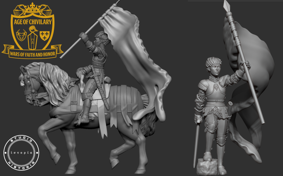 28mm Figure of Joan of Arc mounted without helmet. Product is made in high quality Studio Historia Blended resin, flexible and detailed. The figure comes with a printed paper flag. A wire spear is recommended for the banner. Product is not intended for children.