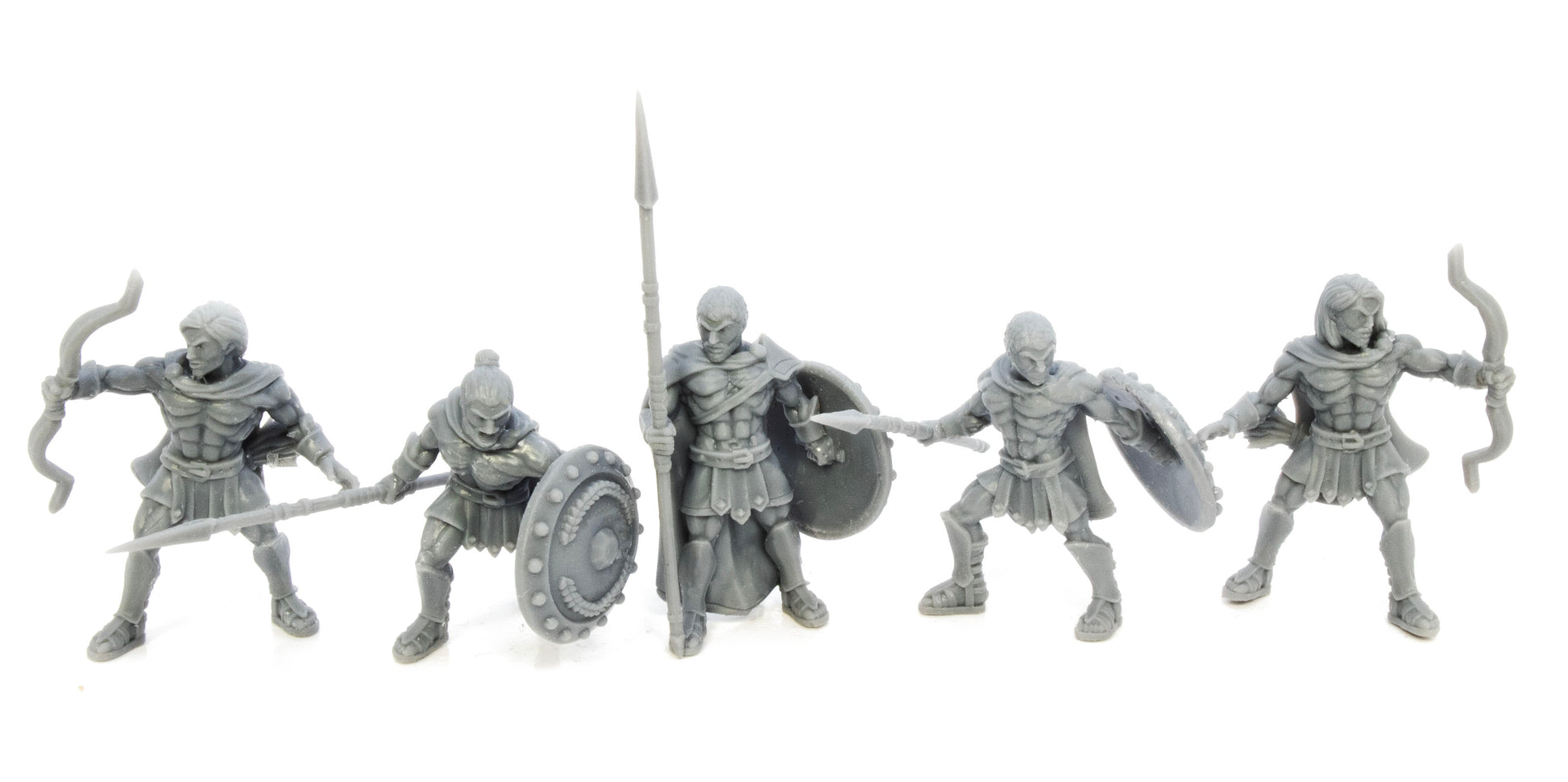 5 Males Spartan Warriors without helmets 28mm figures. 28mm Scale. Product is made in high quality Studio Historia Blended resin, flexible and detailed. Product is not intended for children.