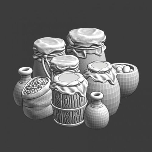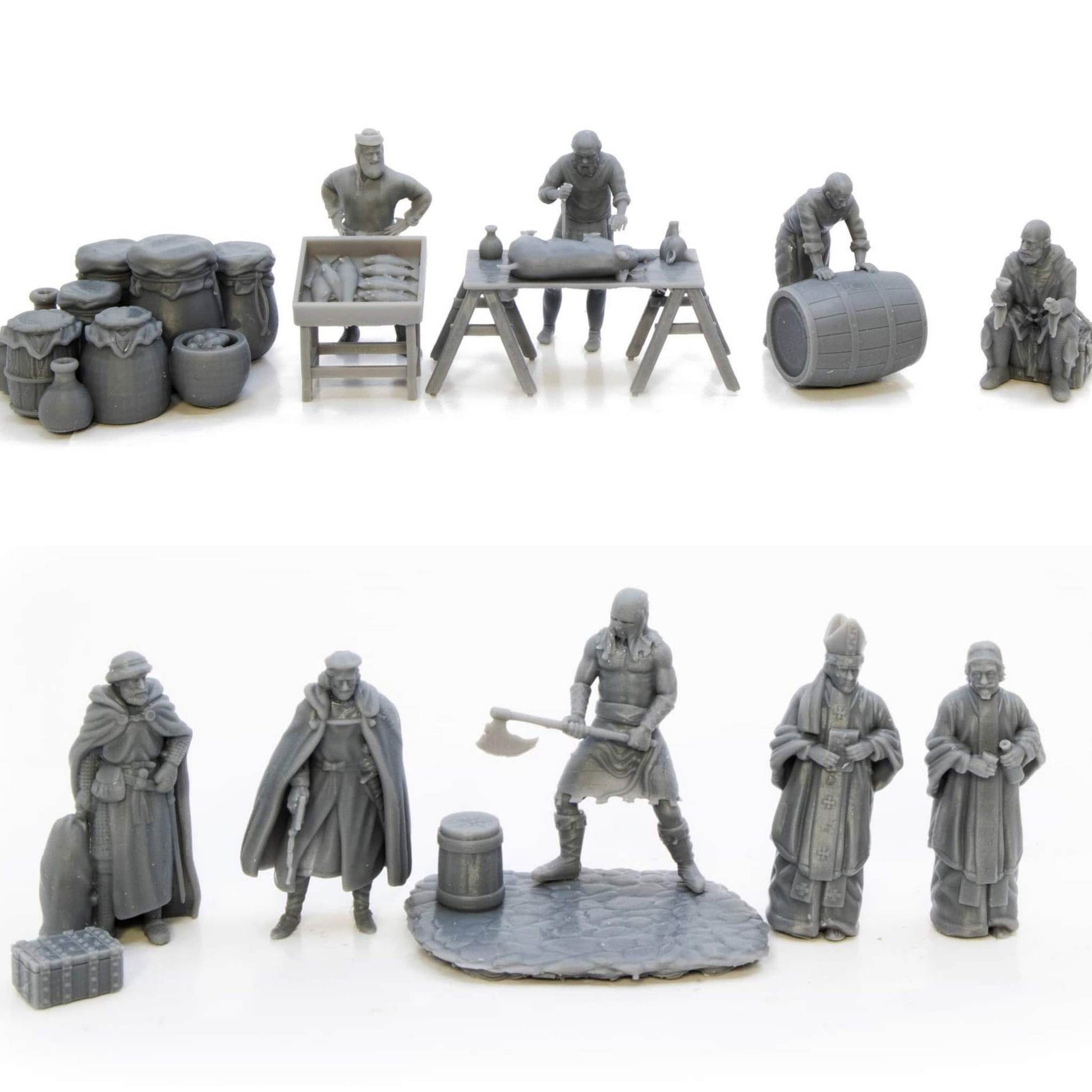 Nine figures and Scatter Terrain. 28mm (1/56 )medieval civilian pack 3D printed figure.