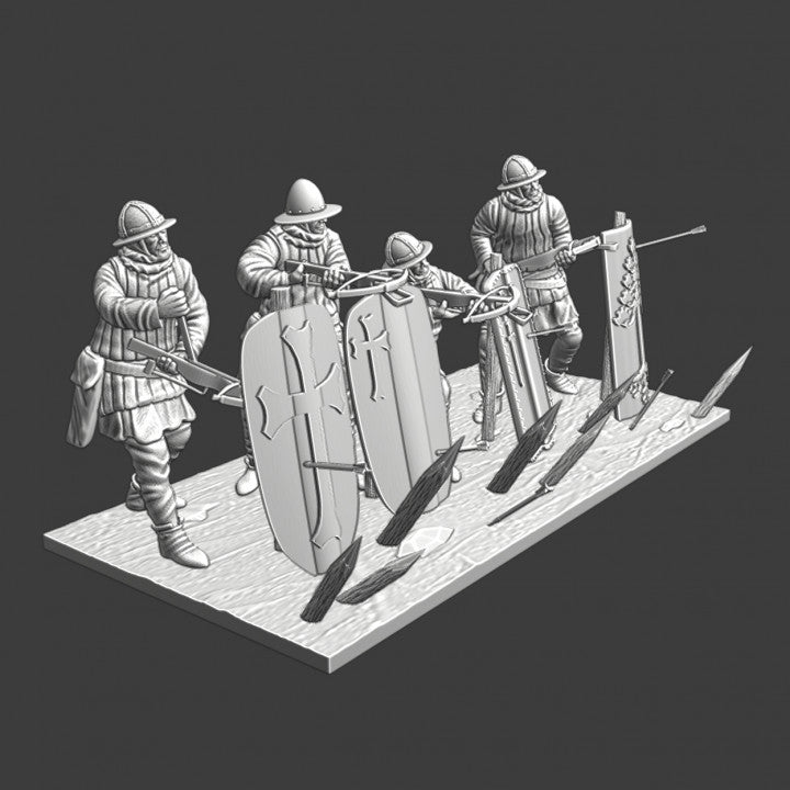 A small scene with 4 medieval crossbowmen standing behind their pavise shields firing at the enemy and palisades