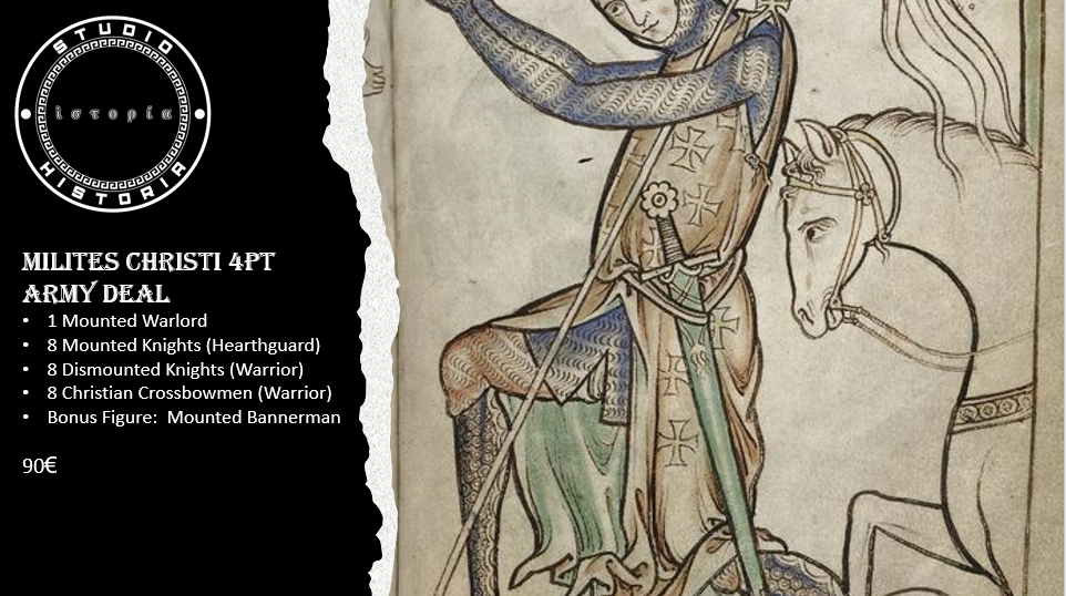 Includes 1 Mounted Warlord , 8 Mounted knights, 8 dismounted knights, 8 Foot Warriors, 8 christians crossbowmen Bonus: Mounted Bannerman.