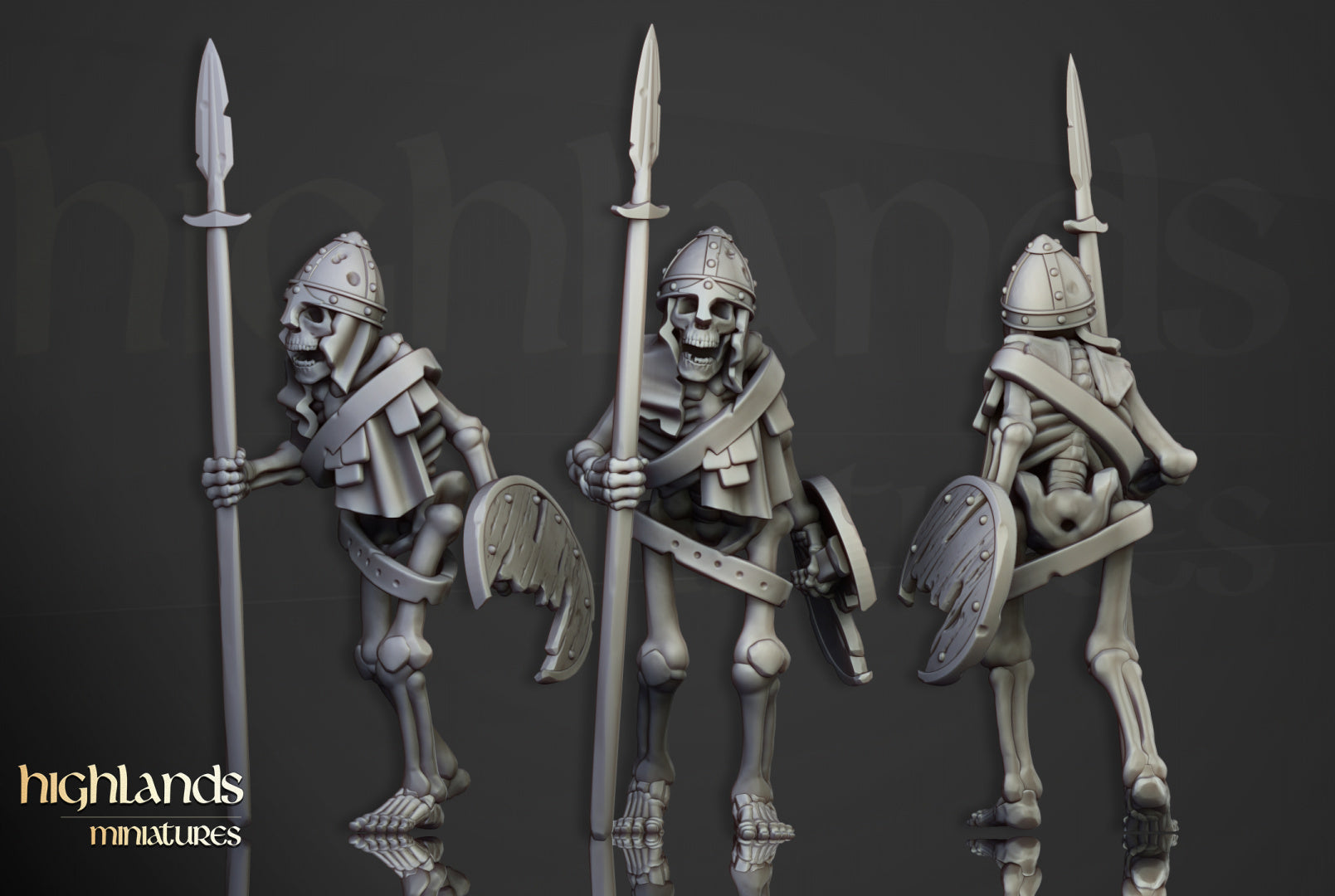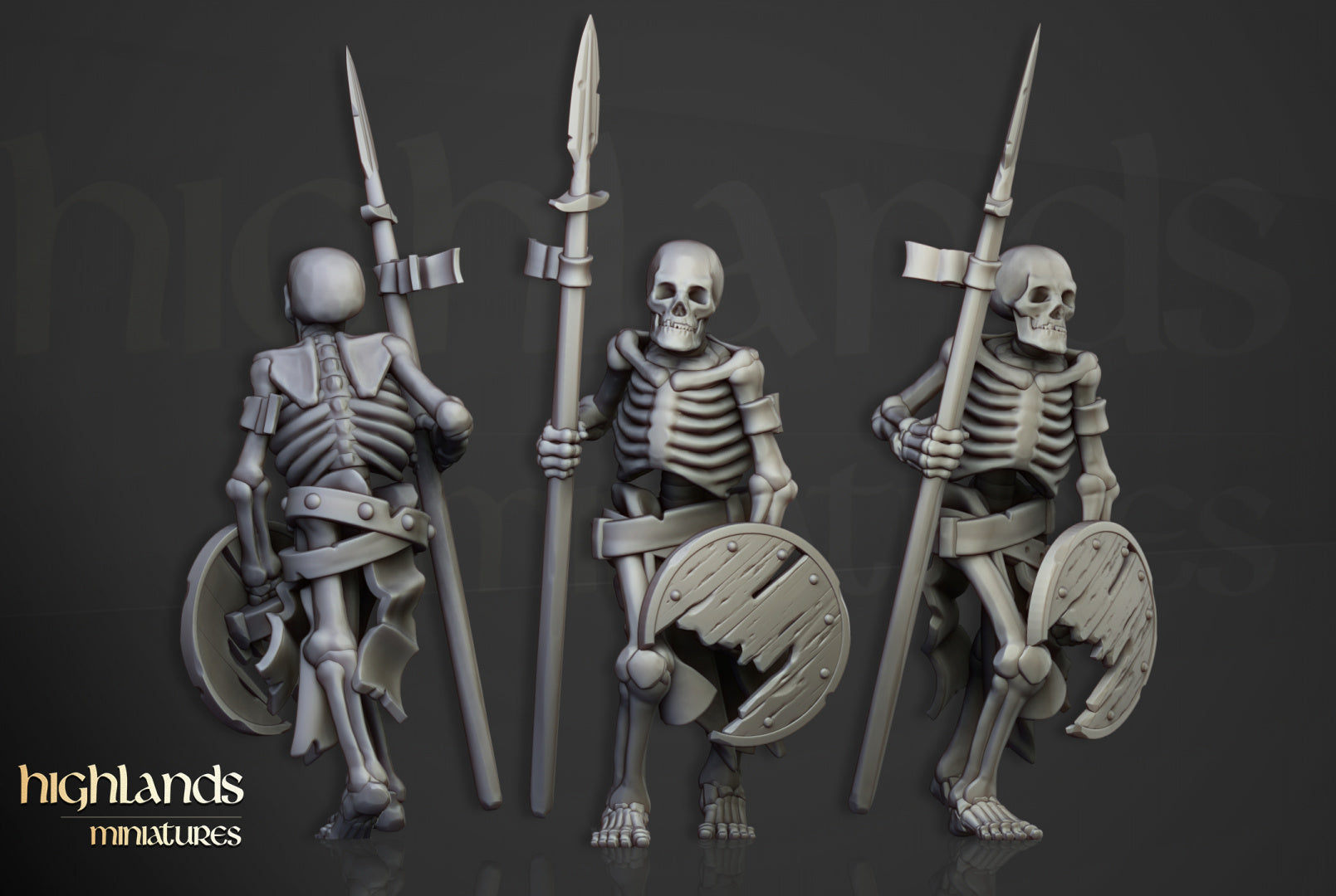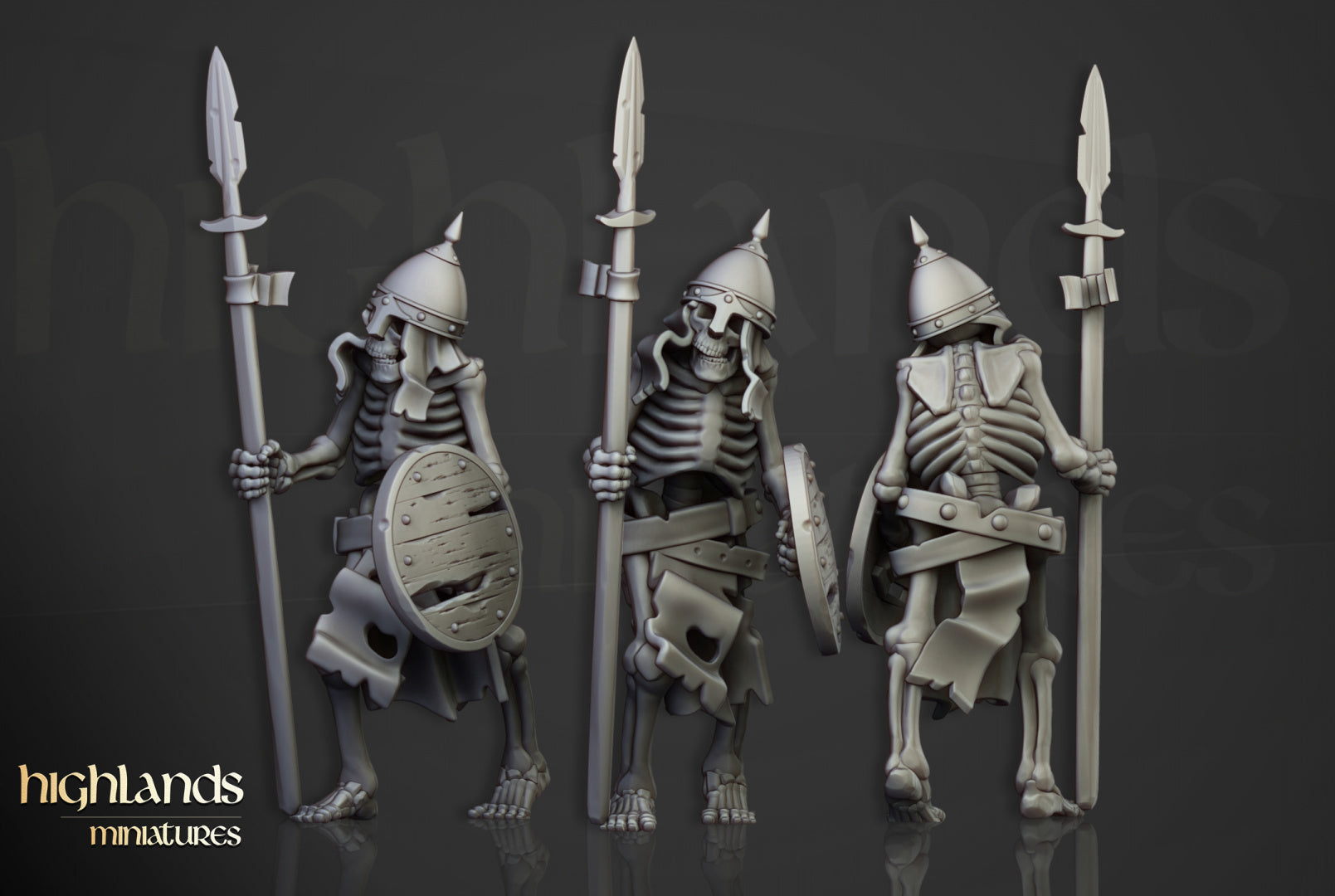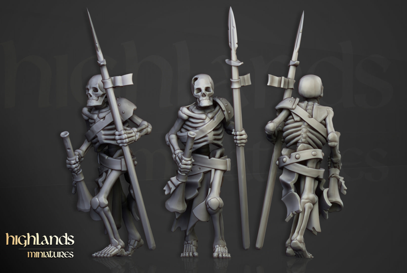 20 Skeleton Warriors Unit and Command (Commander, Musician, Banner) by Highlands Miniatures.