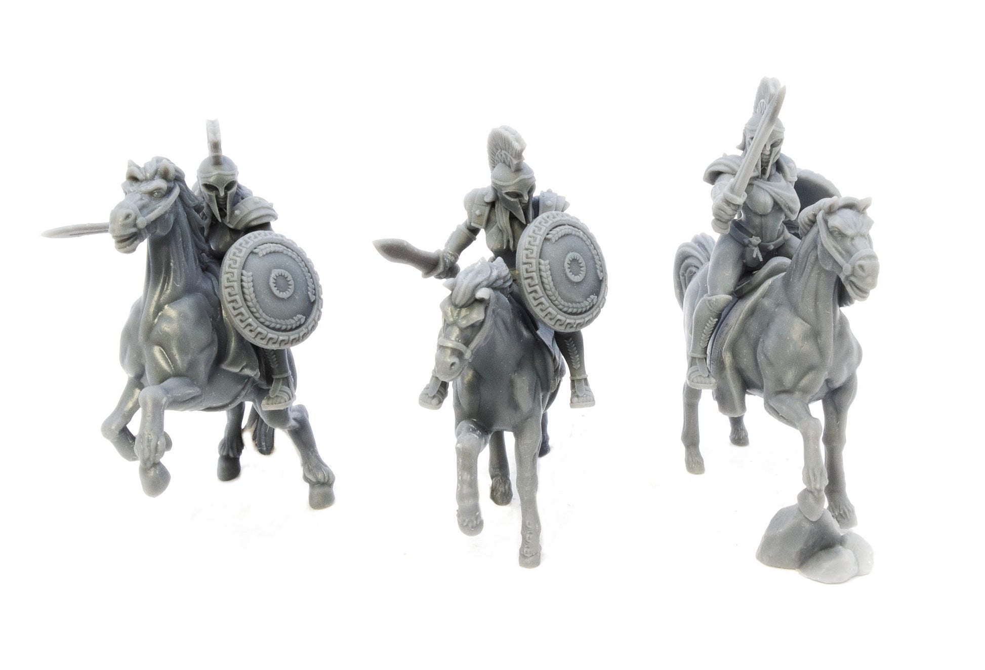 3 Spartan Cavalry with helmets and swords 28mm figures. 28mm Scale. Product is made in high quality Studio Historia Blended resin, flexible and detailed. Product is not intended for children.