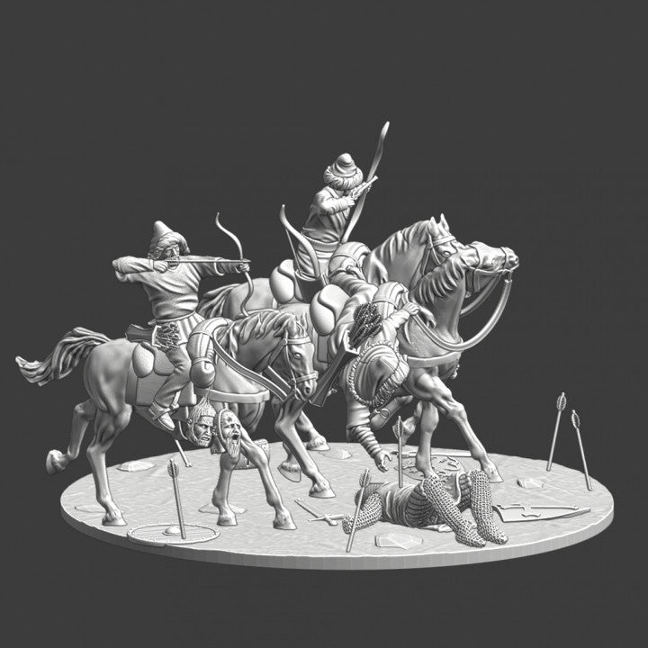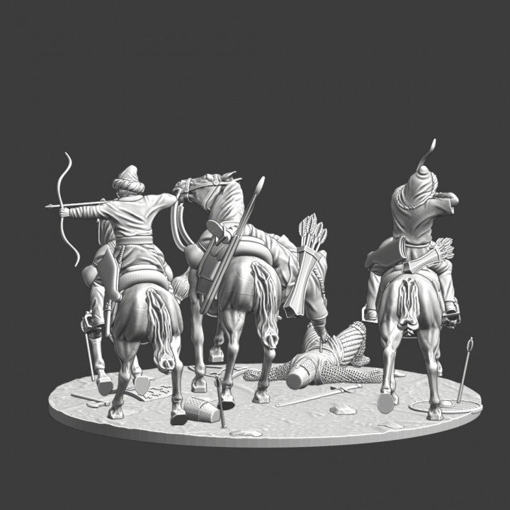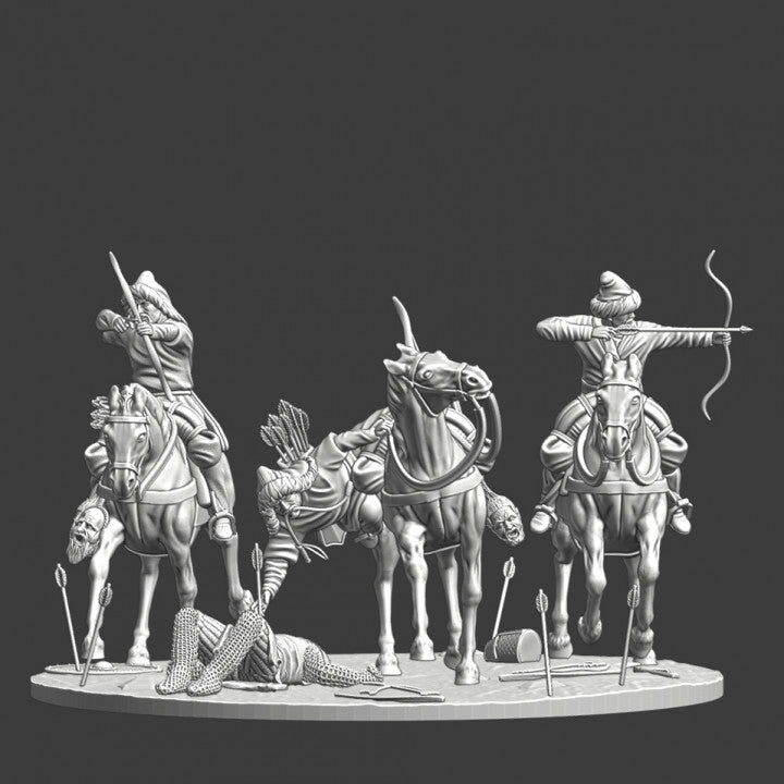 3 mounted figures and one casualty 28mm (1/56 )Mongol warrior