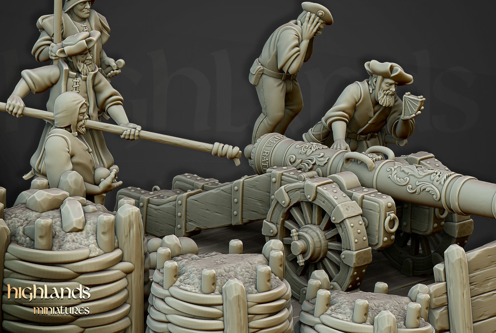 Sunland Artillery Battery with one Volley Gun, one Cannon, and one Mortar team by Highlands Miniatures.