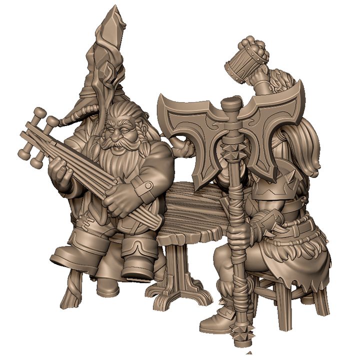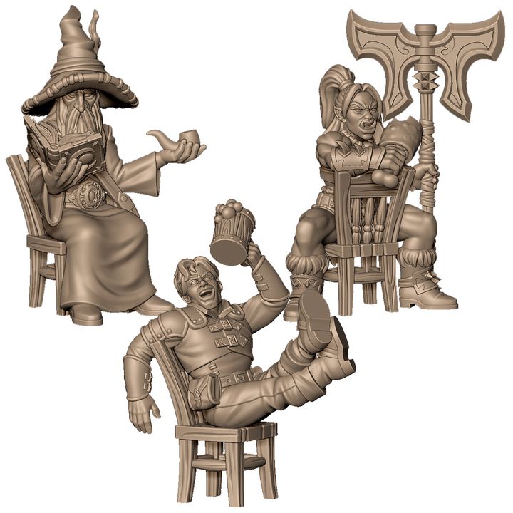 Team of adventure at tavern (warrior, swordman, wizard, musician) by Menagerie Miniature